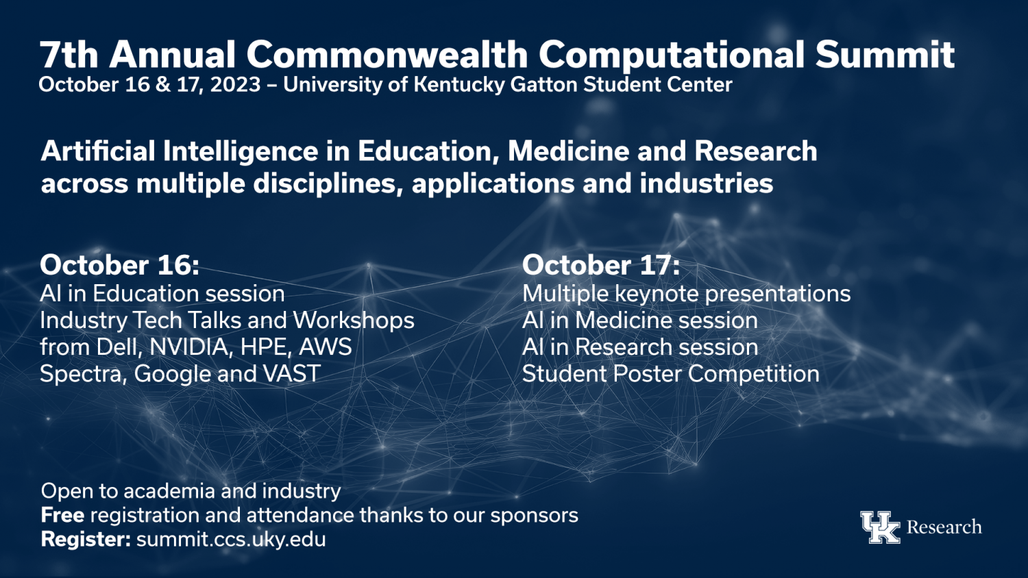 The University of Kentucky’s Center for Computational Science (CCS) and ITS/Research Computing Infrastructure is hosting the 7th Annual Commonwealth Computational Summit (CCS) on October 16-17, 2023, focused on AI in Education, Medicine, and Research. Location: Gatton Student Center Ballroom and Conference Facilities, University of Kentucky, 160 Avenue of Champions, Lexington, KY 40508.
